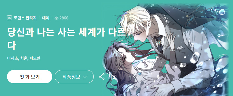 The next title is the Korean translation of “My Husband and I Cannot Live in the Same World”, a webtoon produced by Tappytoon Studio, based on a Korean webnovel and first published in English. It launched in Korea on May 28th on Comico, Mr. Blue, and Naver Webtoon (Korea). With 3 free episodes and 32 paid episodes, it has 2,866 views after 19 days on the platform.