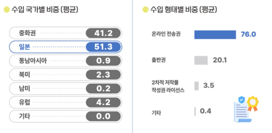 The content import figures tell a significantly different story. Again, the vast majority of incoming content comes from Japan which is no wonder considering the popularity of manga and anime in Korea. But China comes in at a close second which isn’t a surprise for anyone who regularly visits Korean webtoon platforms and sees the large numbers of Chinese titles on offer.