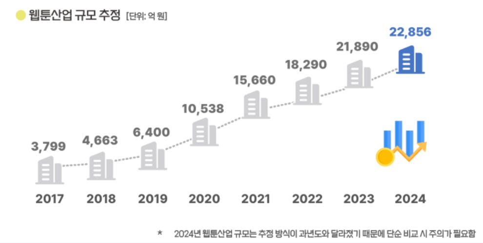 The webtoon industry was projected to be 2.2856 trillion KRW in 2024 which represents a 4.4% increase compared to the year before. This is the first time that the Korean government has used Nationally Approved Statistics to measure the size of the industry, so the comparison isn’t one-to-one.