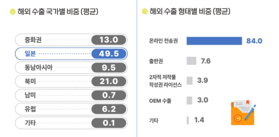 When it comes to webtoon exports, Japan takes up 49.5% while North America takes up 21.0%. Behind that we have China with 13.0%, Southeast Asia with 9.5%, Europe at 6.2% and South America at 0.7%. These are based on averages, not actual numbers of exports.
