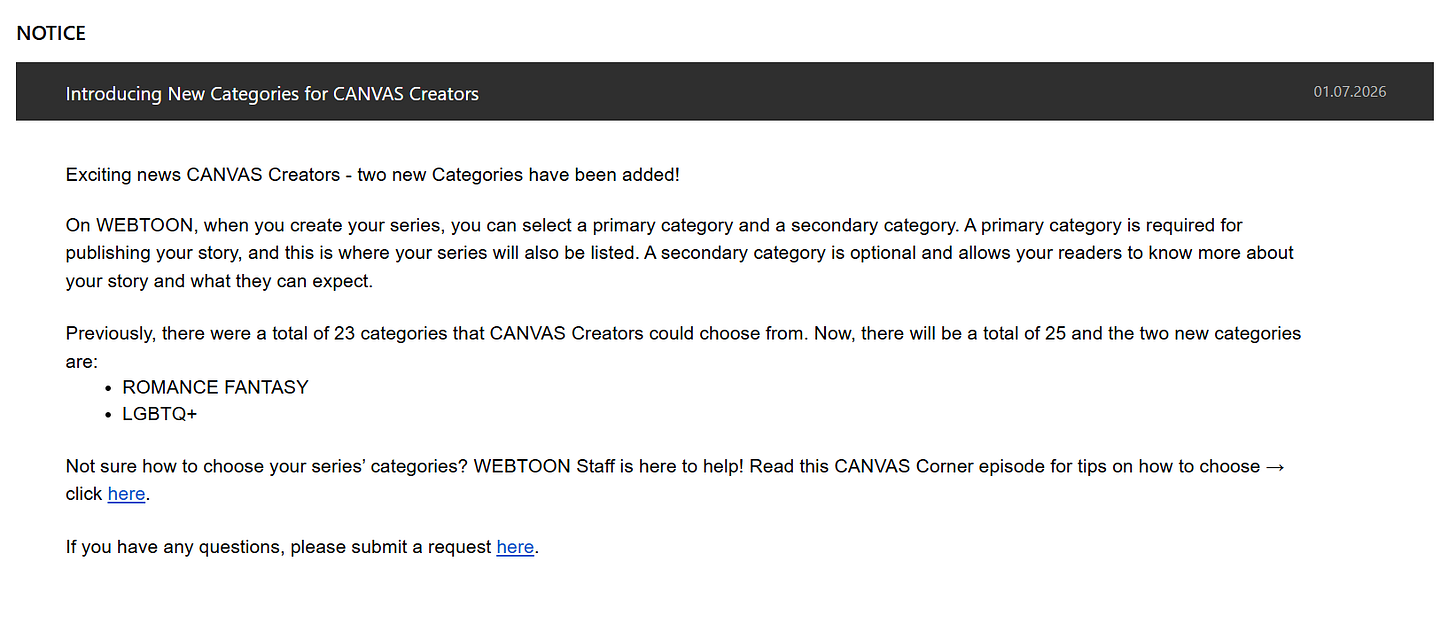 And finally… WEBTOON is adding two new categories to CANVAS. They are LGBTQ+ and Romance Fantasy.