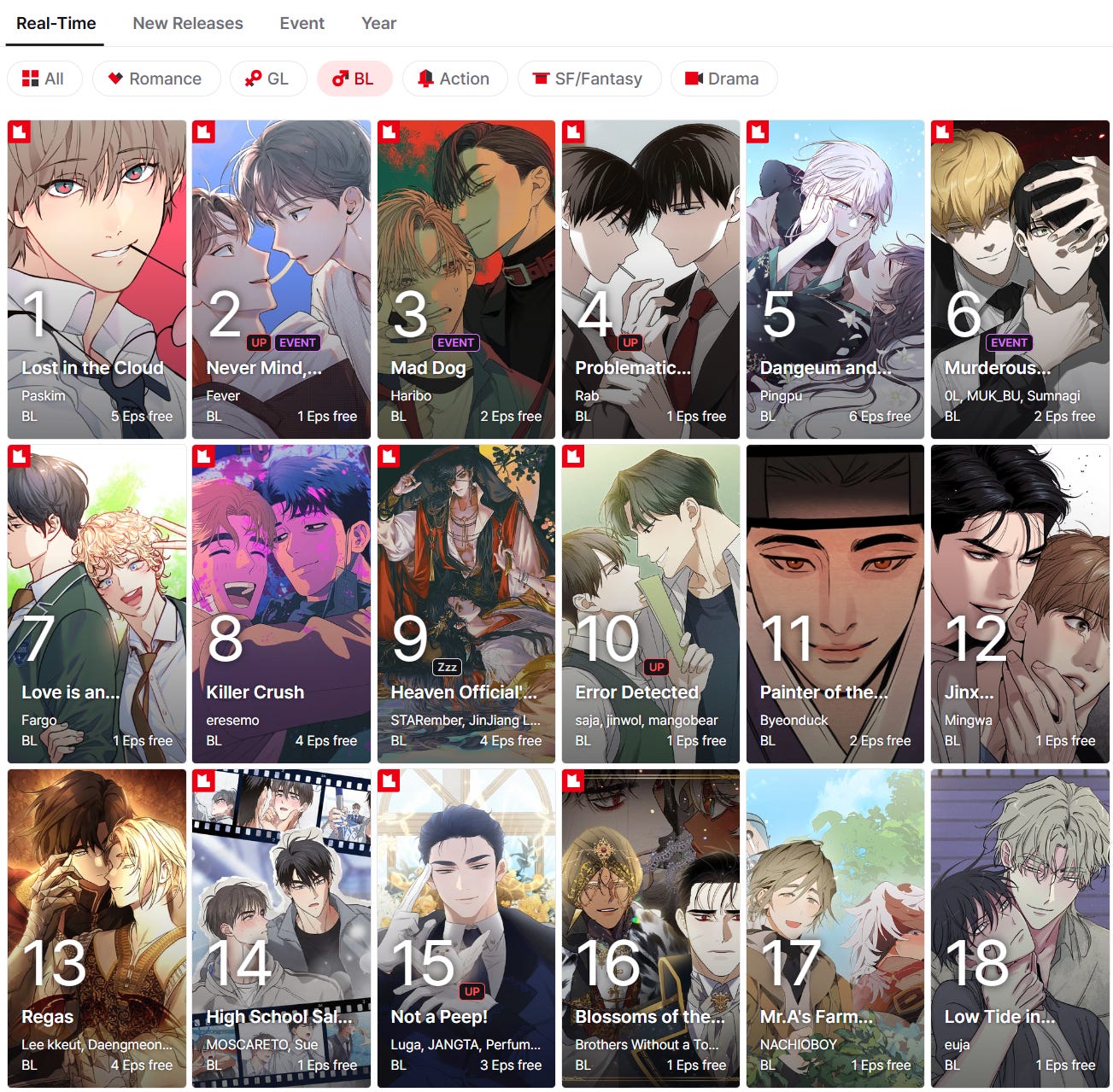 Let’s take a quck look at Lezhin’s current rankings in terms of all-ages BL titles.