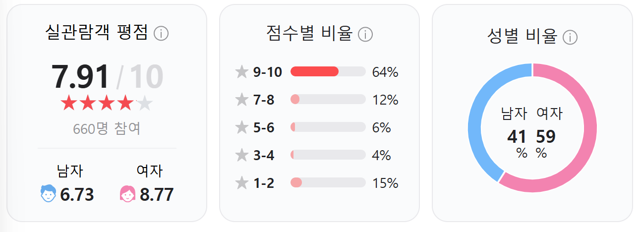 Right now, “Omniscient Reader: The Prophet” is sitting on a 7.91 stars out of ten with 64% of audiences giving the film a soild 64. The bigger surprise is the average rating according to gender with men giving the film a 6.73 on average while women gave it an 8.77.